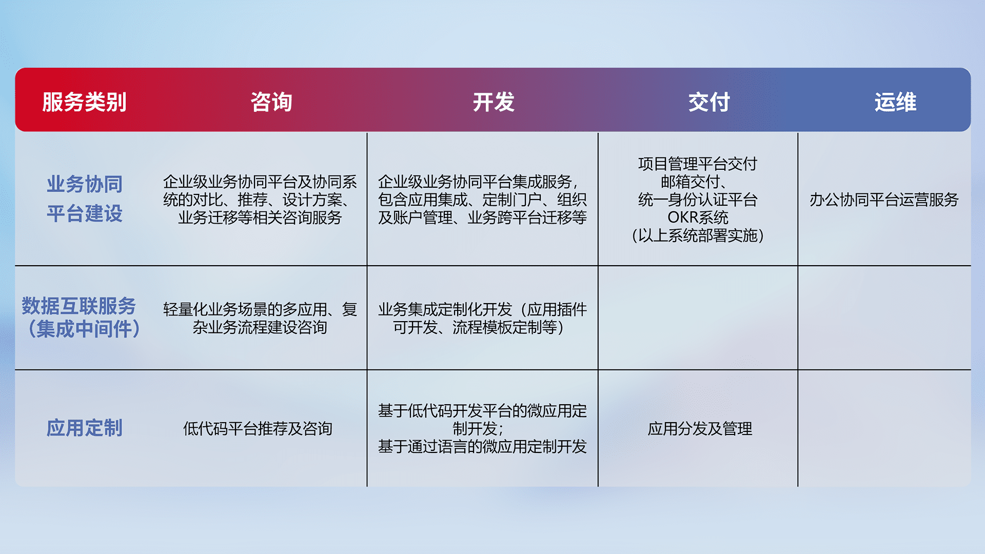 针对钉钉、、企微、、、IDaas等平台级产品提供产品的规划、、、、方案、、交付、、、定制化开发等服务,,,,实现如统一协同办公、、、智能客户服务、、混合会议管理、、、、智能数据查询、、等业务场景,,,实现数字化转型。。。