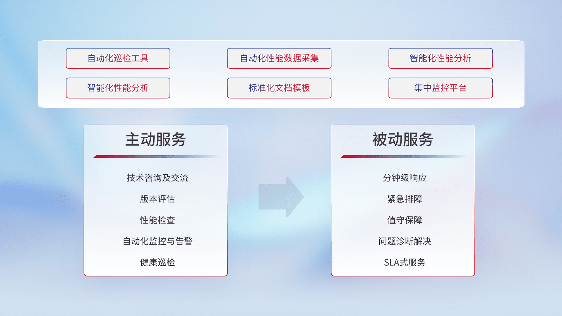 智能化工具和标准化文档,,,,保障服务质量,,提供主动服务(包含技术咨询、、版本评估、、、性能检查、、自动化监控与告警、、、、健康巡检)和被动服务包含(分钟级响应、、紧急排障、、、值守保障、、、、问题诊断解决、、、SLA服务)。。。